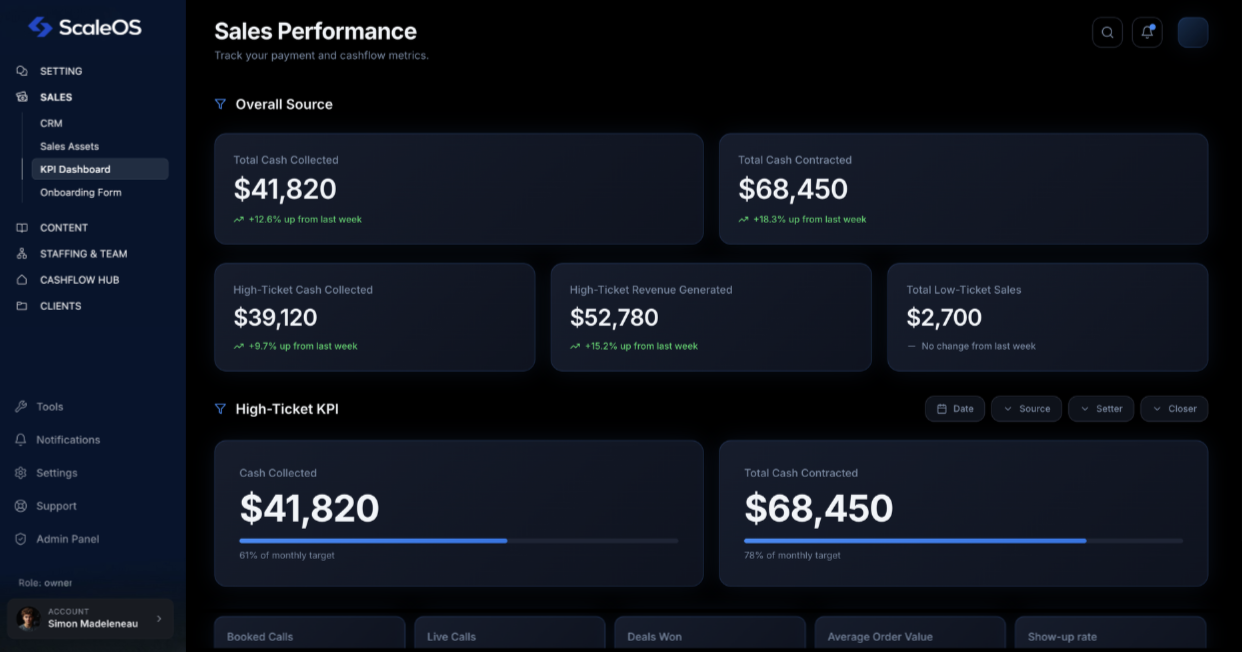 Track cash collected, calls booked, leads, team KPIs, client LTV, and revenue per YouTube video — all in real time.